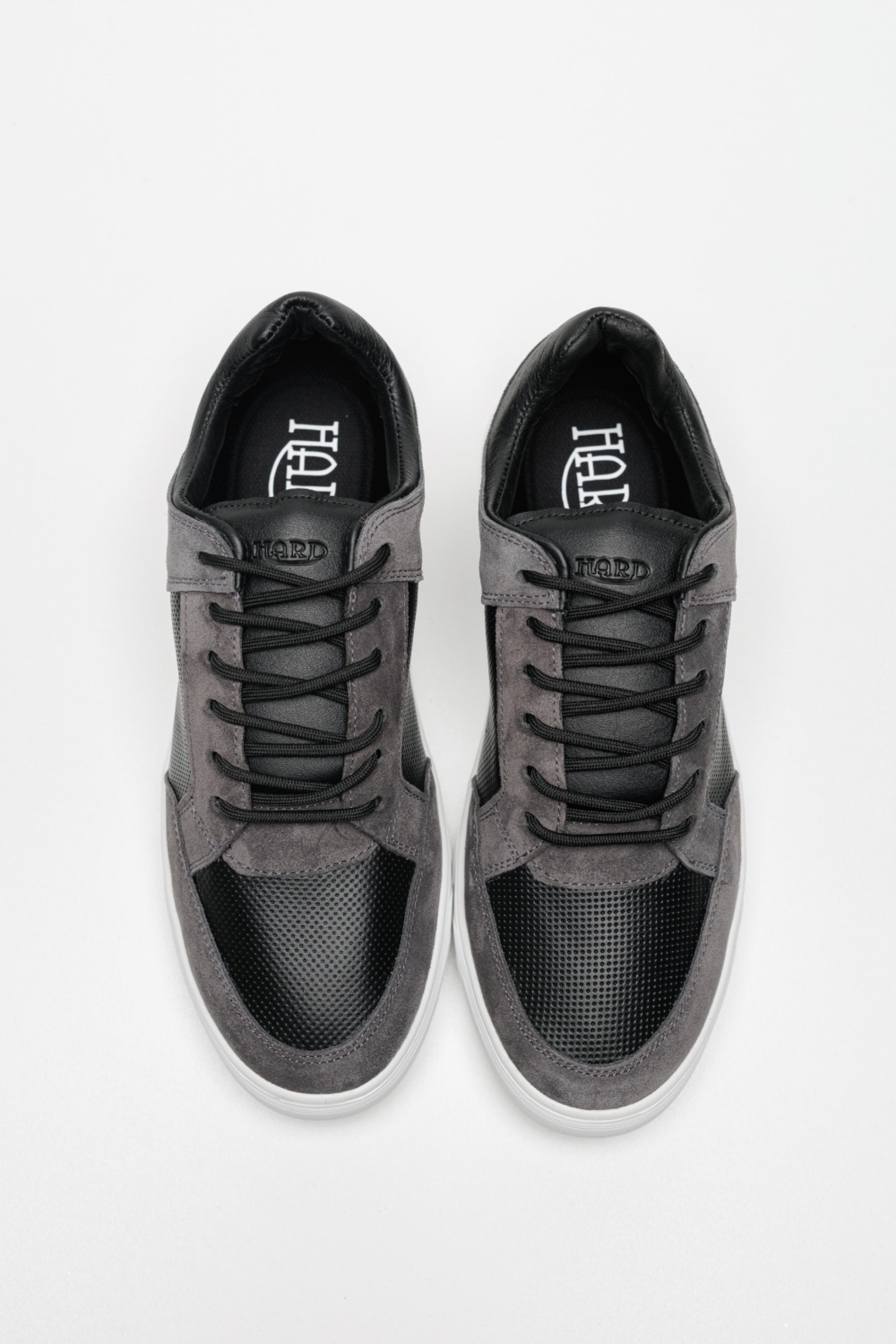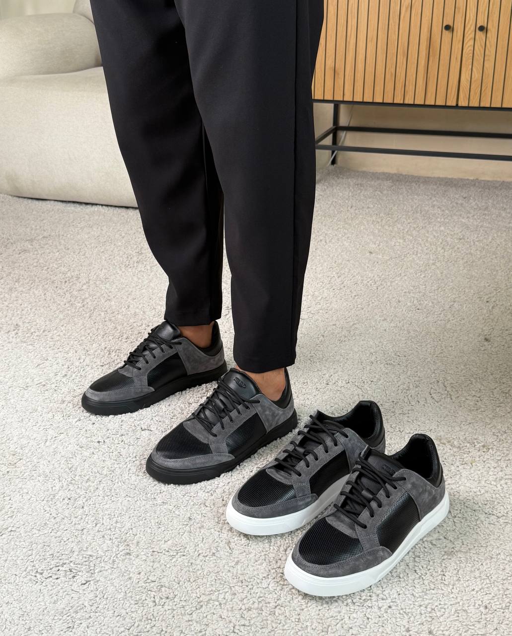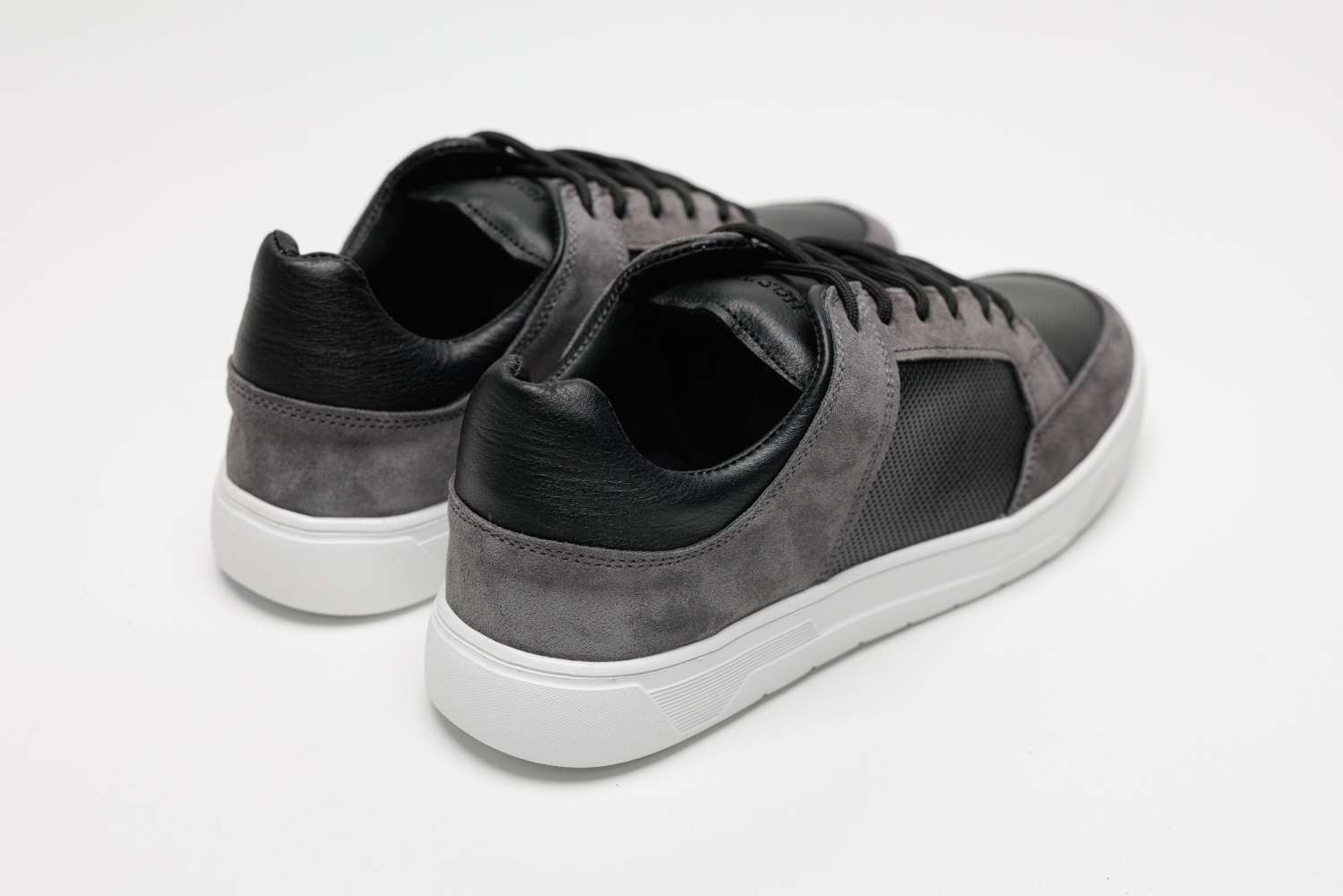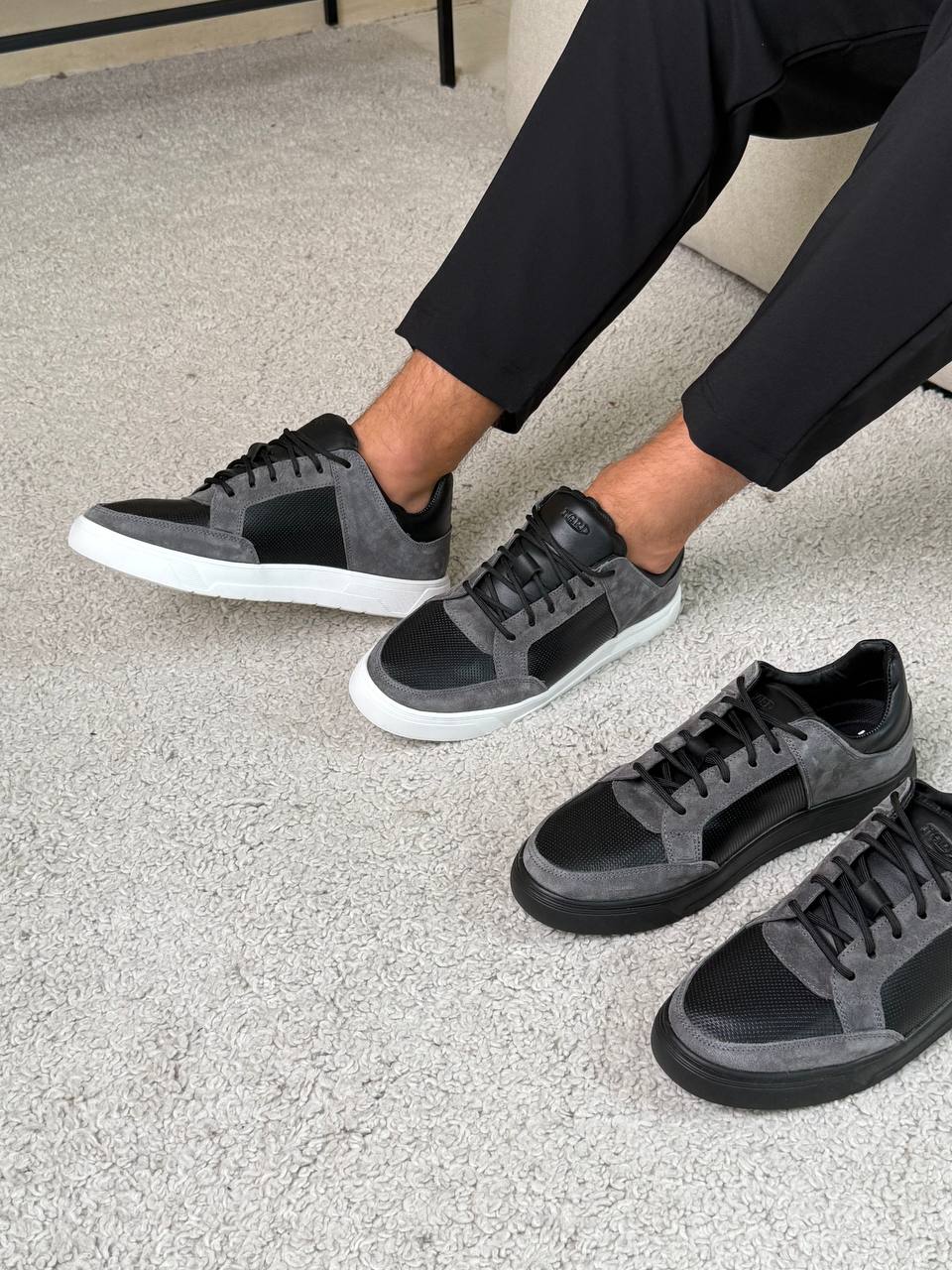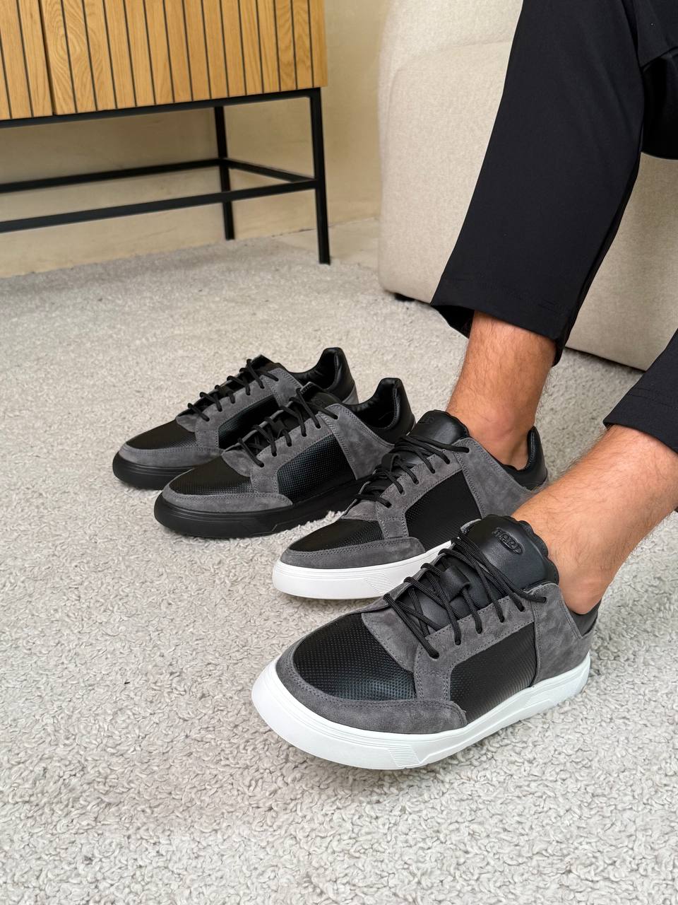 Виконані з натуральної шкіри сірого кольору з чорними акцентами, білою подошвою та ефектом перфорованої текстури, вони виглядають свіжо й модно, не втрачаючи елегантності.