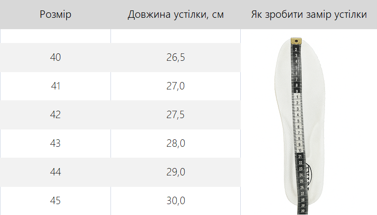 (замір зазначений за устілкою)