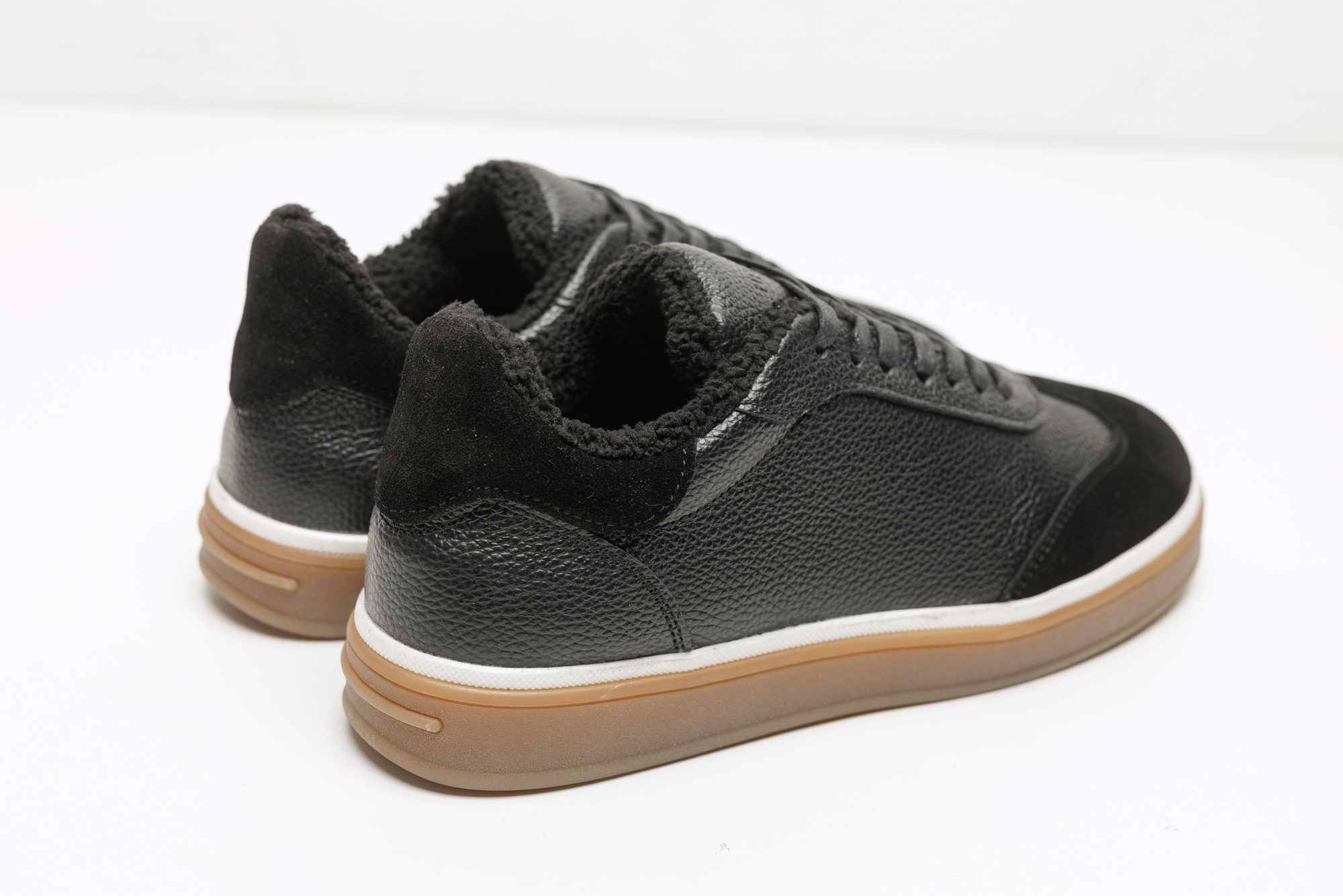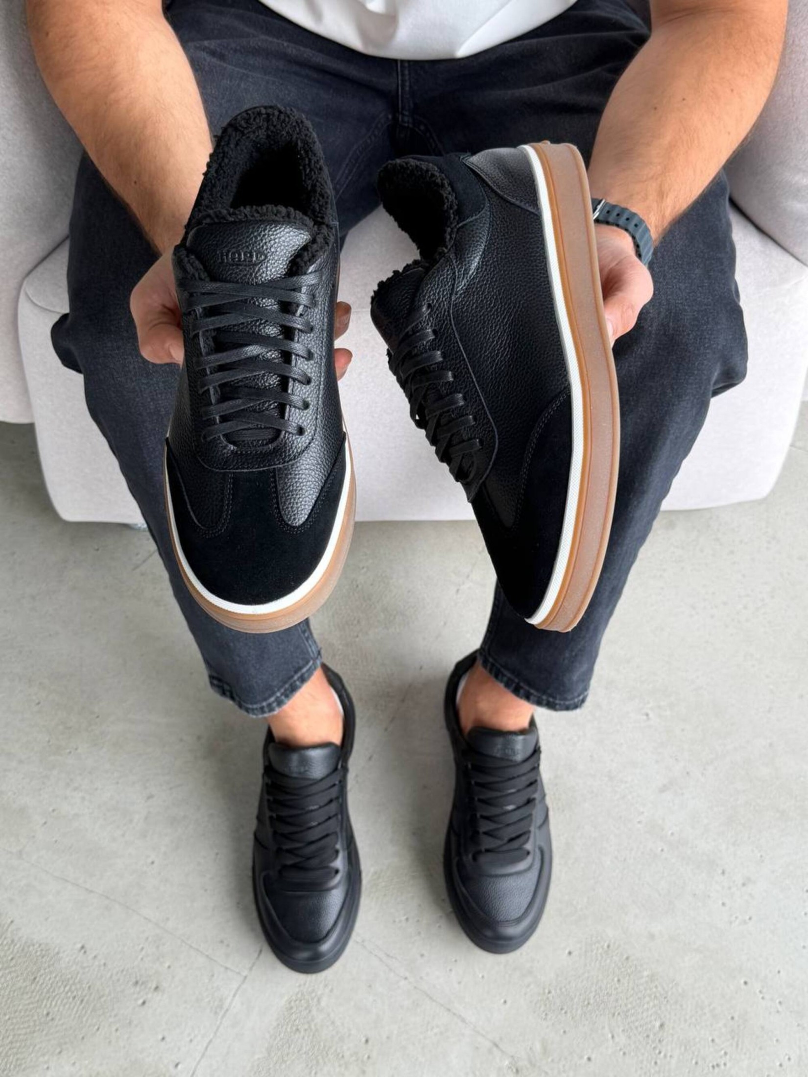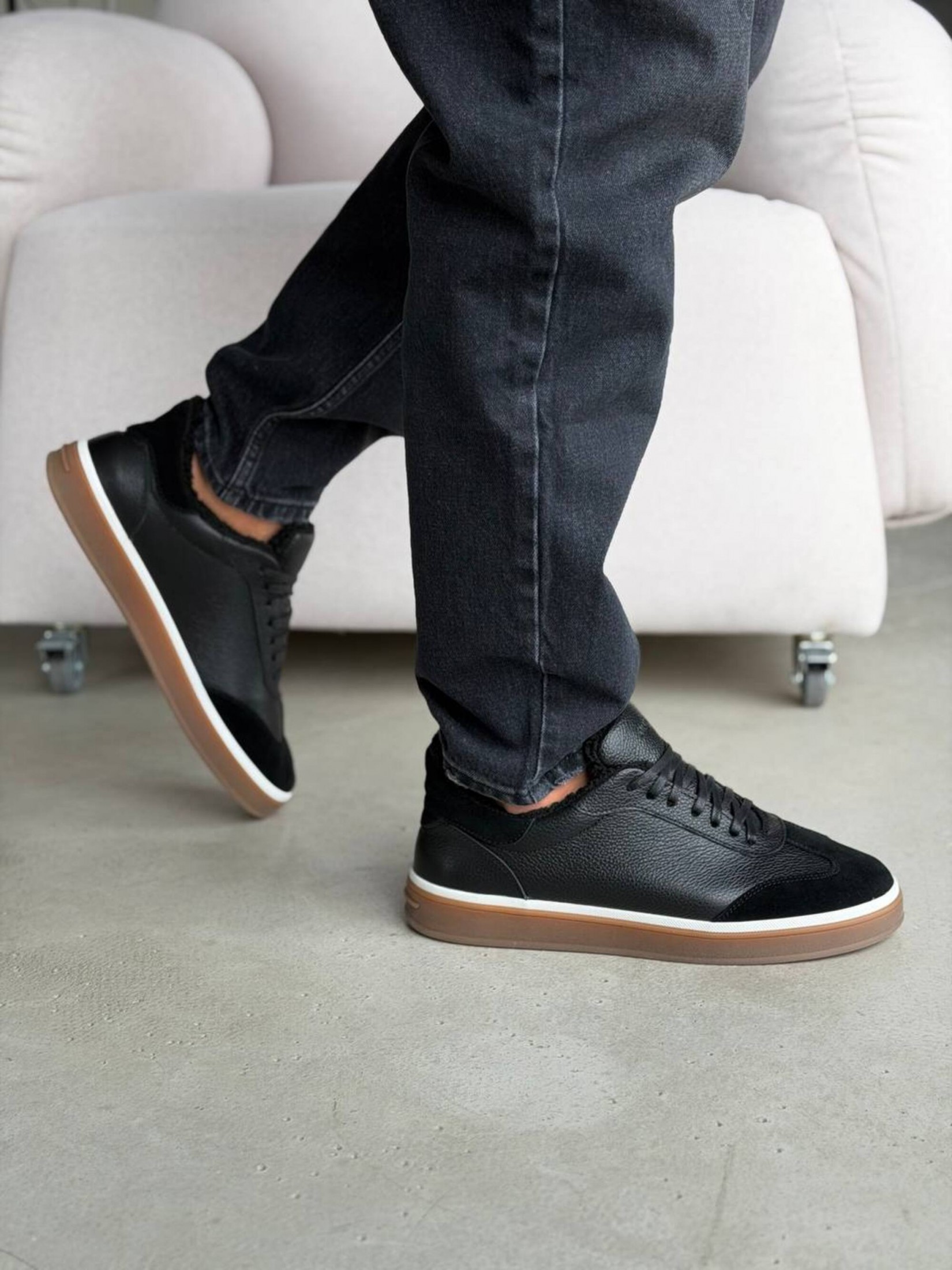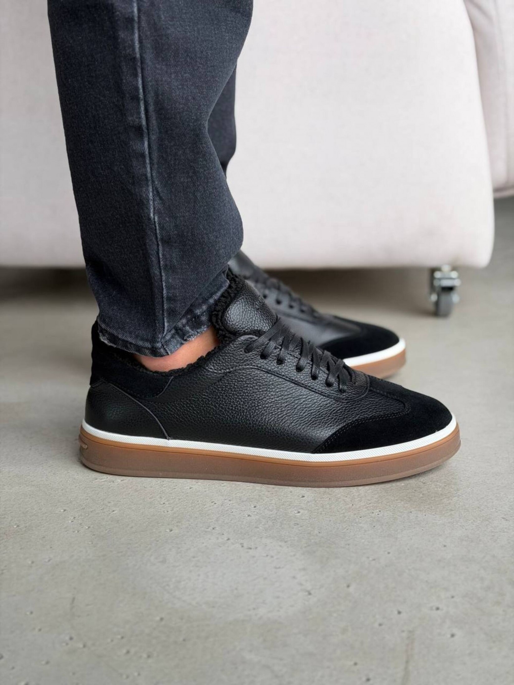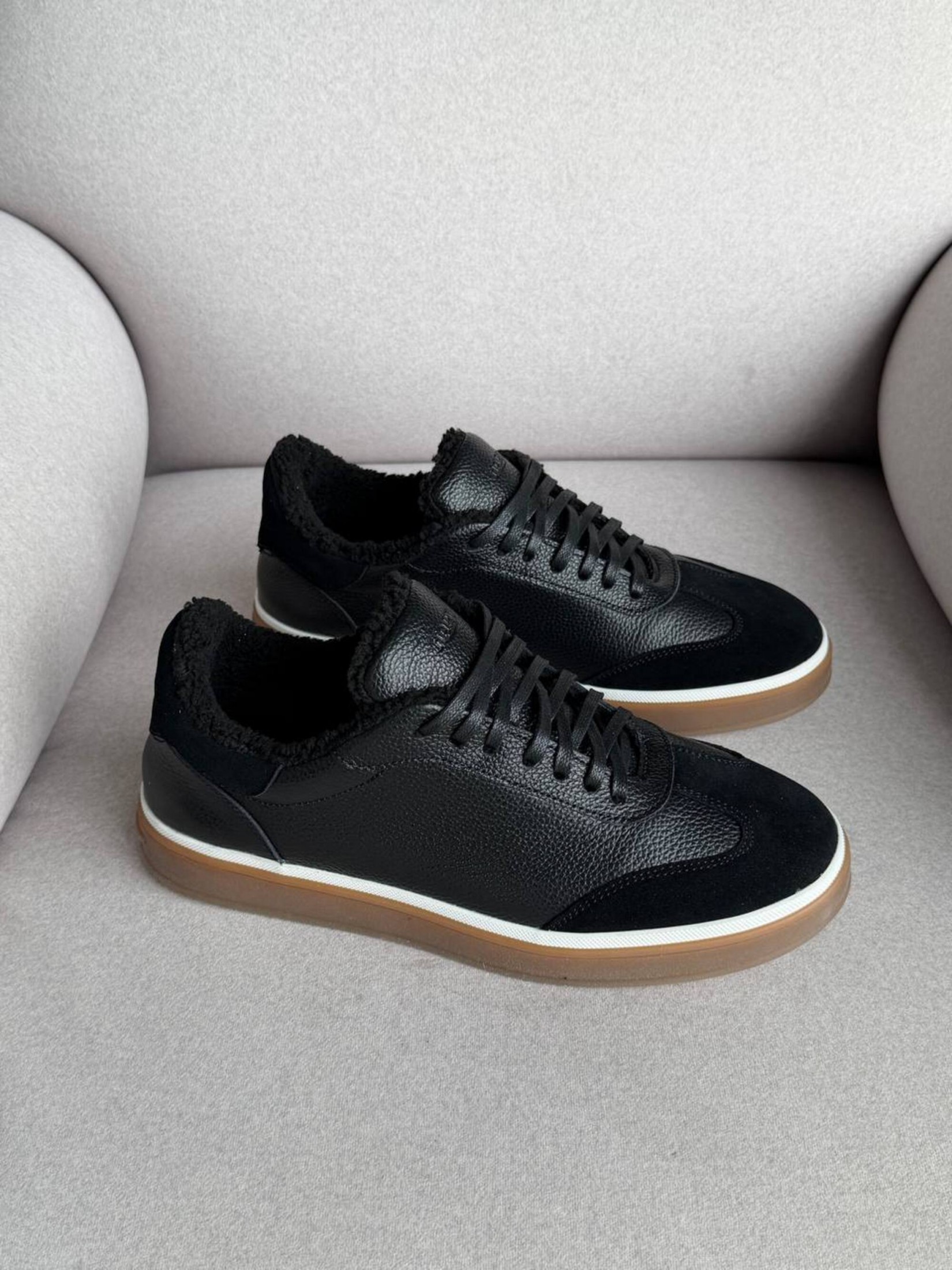 Чоловічі чорні кеди з натуральної шкіри та замші в стилі casual. Лаконічний дизайн із поєднанням різних фактур виглядає стримано й сучасно, легко комбінується з джинсами, чіносами, повсякденними брюками, футболками чи светрами. М’яка хутряна підкладка забезпечує додатковий комфорт у прохолодну погоду, а зручна підошва підходить для активного міського ритму. Практичний варіант для прогулянок, щоденних справ, зустрічей із друзями або роботи у невимушеному форматі.
