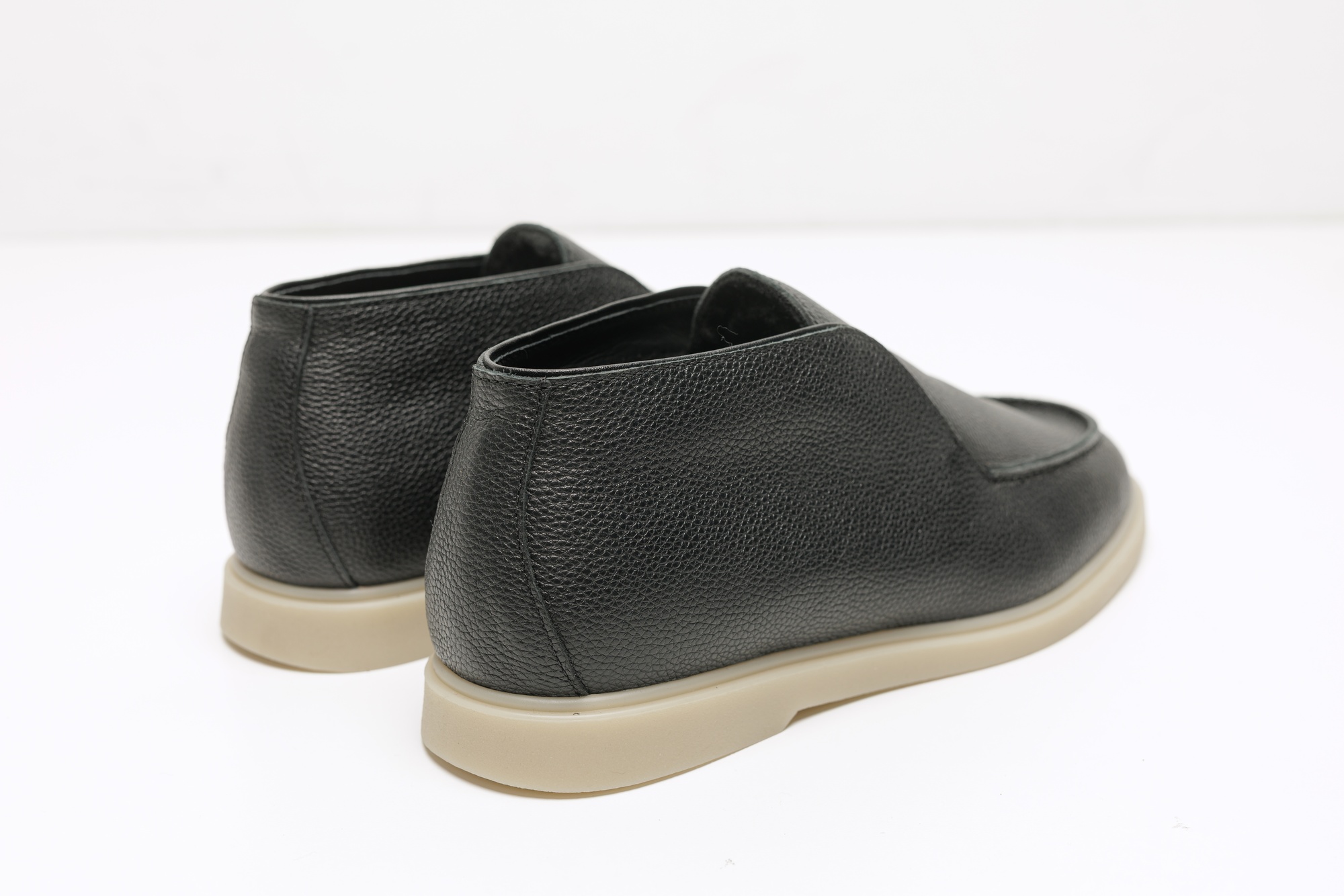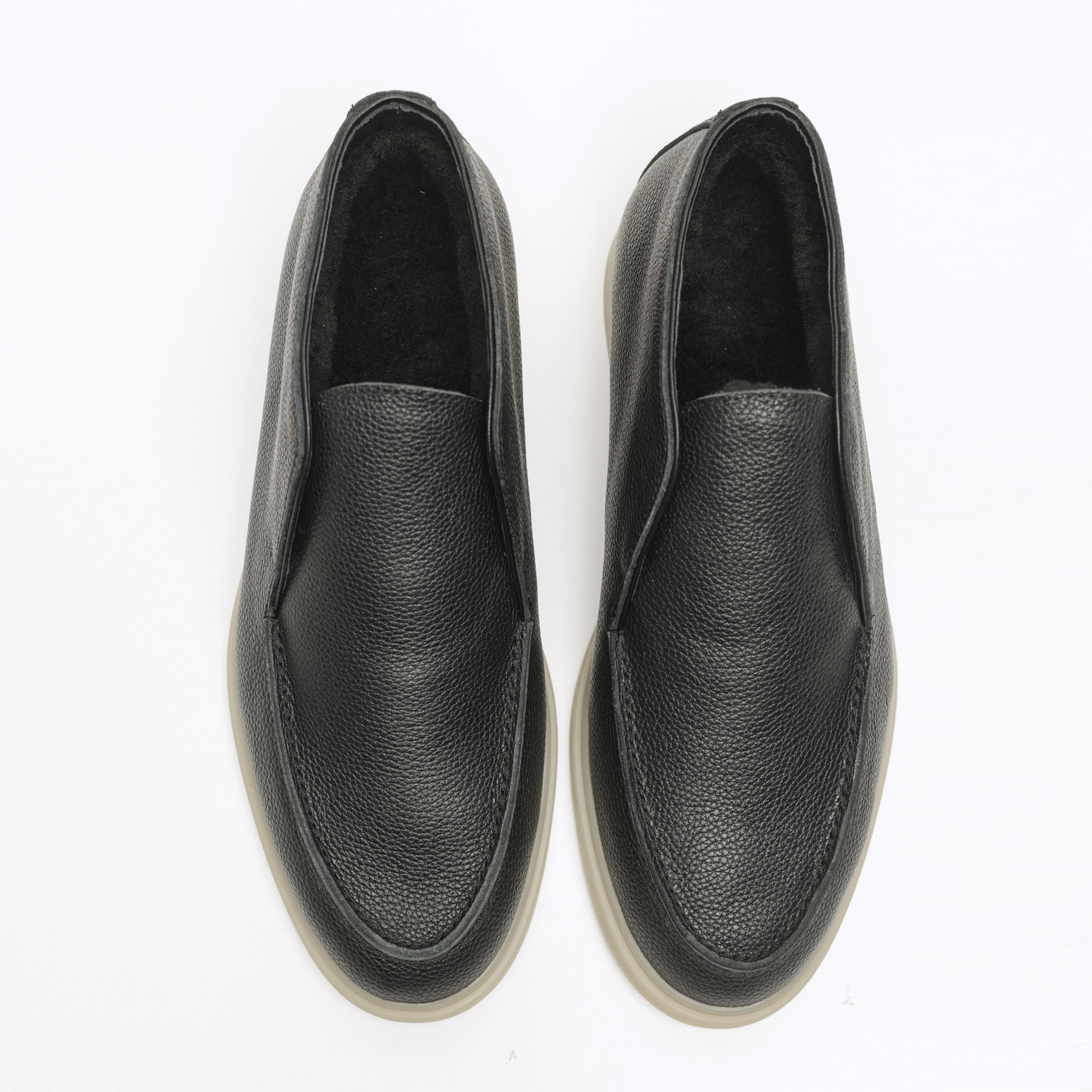 Чоловічі високі лофери з чорної шкіри на хутрі — практичне та стримано-елегантне взуття для холодної пори року. Високий крій забезпечує надійну фіксацію стопи, а м’яка хутряна підкладка дарує тепло та комфорт під час носіння. Натуральна шкіра з вираженою текстурою підвищує зносостійкість і зручність у догляді. Лаконічний дизайн з акуратною прострочкою підкреслює мінімалізм моделі, а універсальний чорний колір легко поєднується з повсякденними та класичними образами. Світла поліуретанова підошва забезпечує комфорт, амортизацію та довговічність у щоденному використанні.