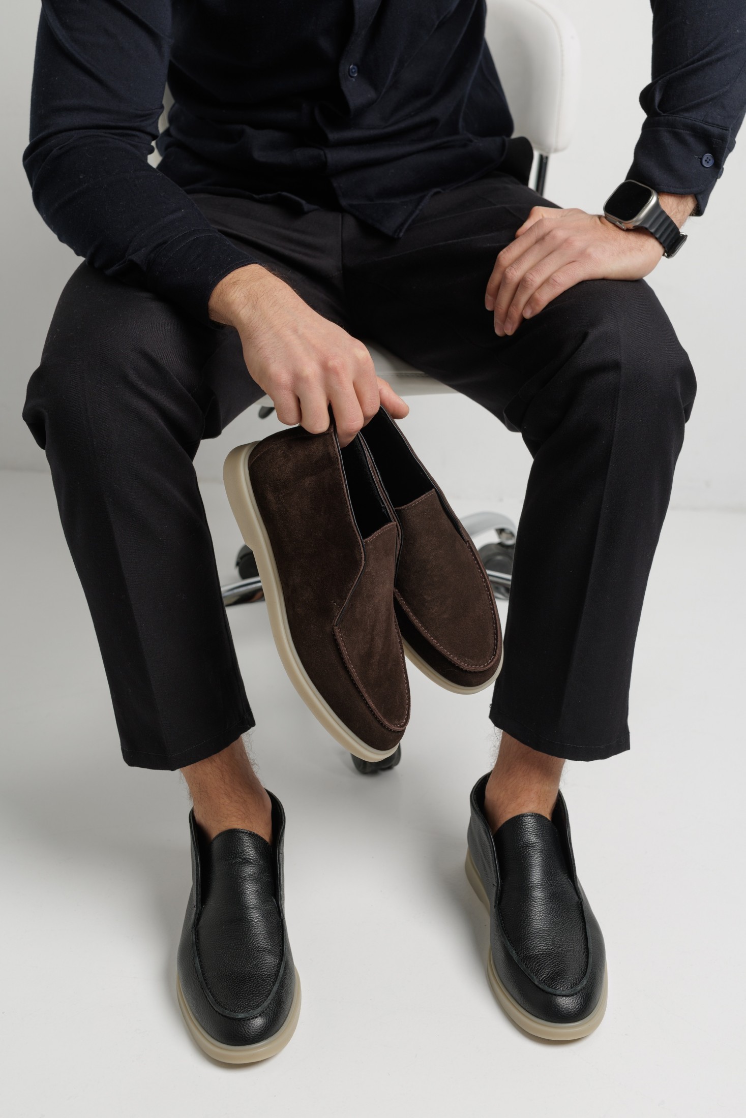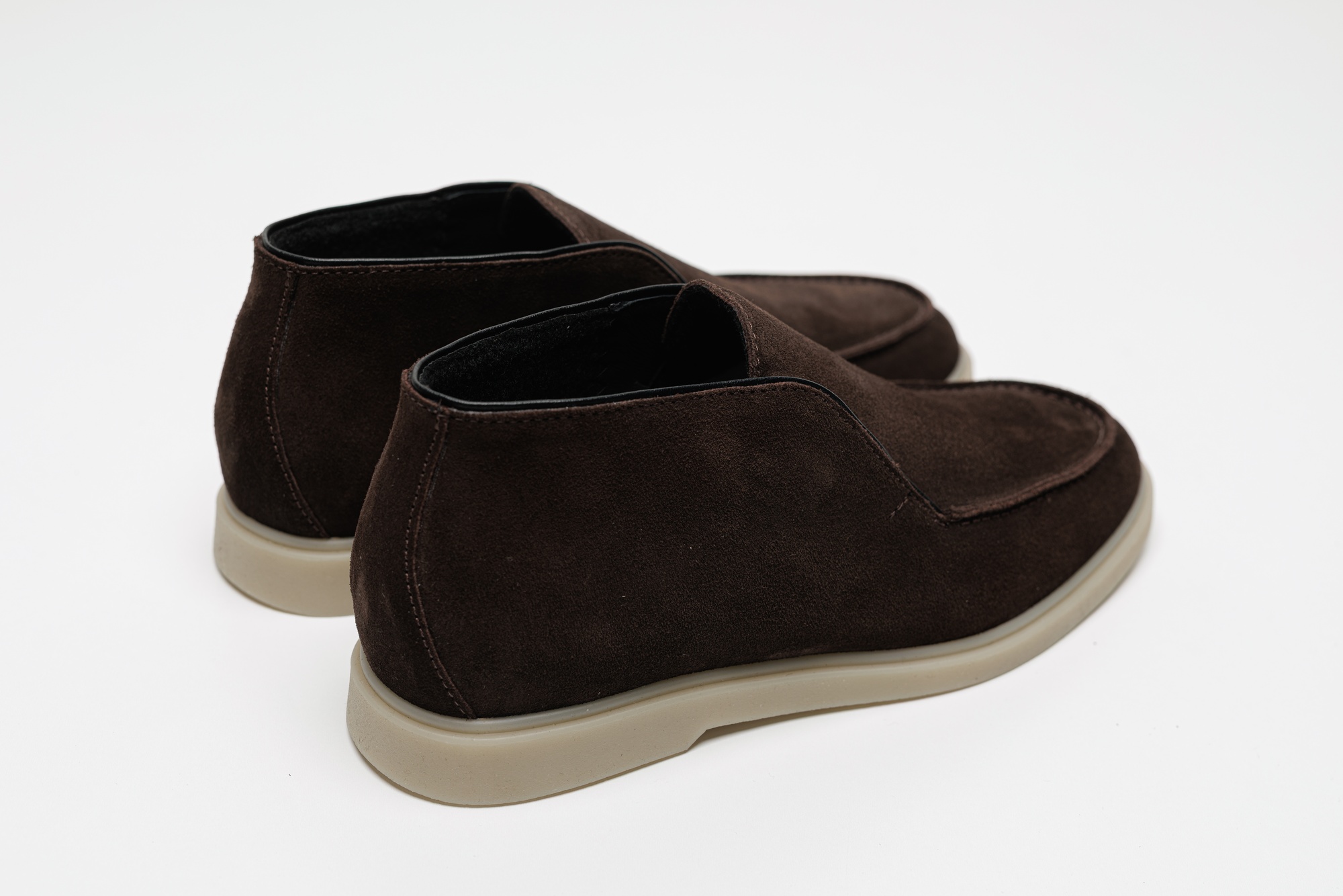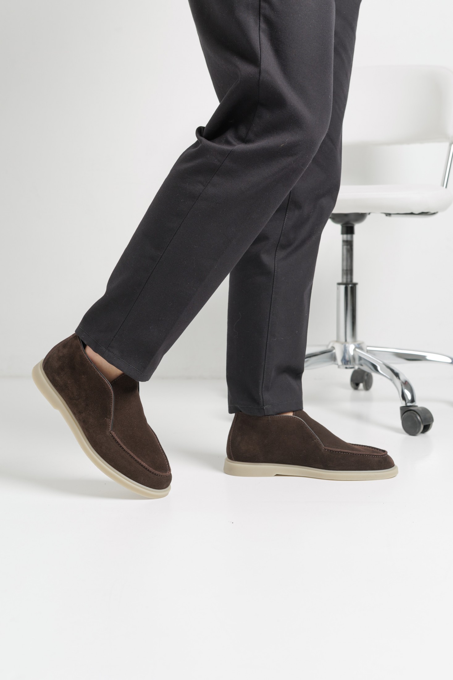 Чоловічі високі лофери з натуральної замші темно-коричневого кольору на флісі — практичне рішення для повсякденного гардероба з акцентом на комфорт і стриманий стиль. Модель має акуратний підвищений силует, який забезпечує додаткову зручність під час носіння, а м’яка флісова підкладка робить взуття комфортним у прохолодну погоду та міжсезоння. Чіткі лінії крою та мінімальна прострочка створюють охайний зовнішній вигляд без зайвих декоративних елементів. Темно-коричнева замша виглядає тепло й благородно, легко поєднується з джинсами, чіносами, вовняними або бавовняними брюками, а також з верхнім одягом у нейтральних і природних відтінках. Світла поліуретанова підошва додає легкого контрасту, добре амортизує під час ходьби та відзначається зносостійкістю. Ця модель стане вдалим вибором для міського ритму, роботи, поїздок і щоденного використання.
