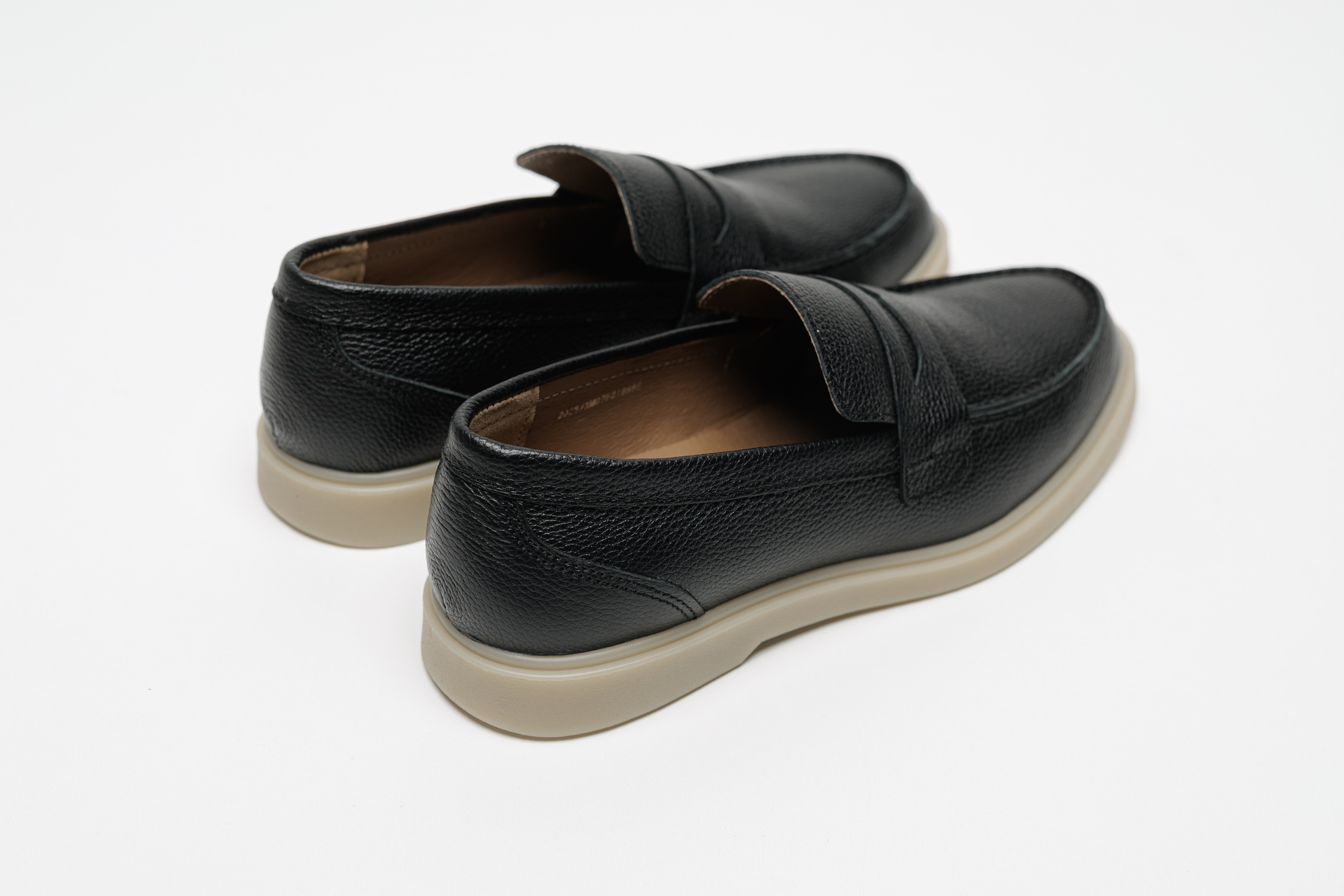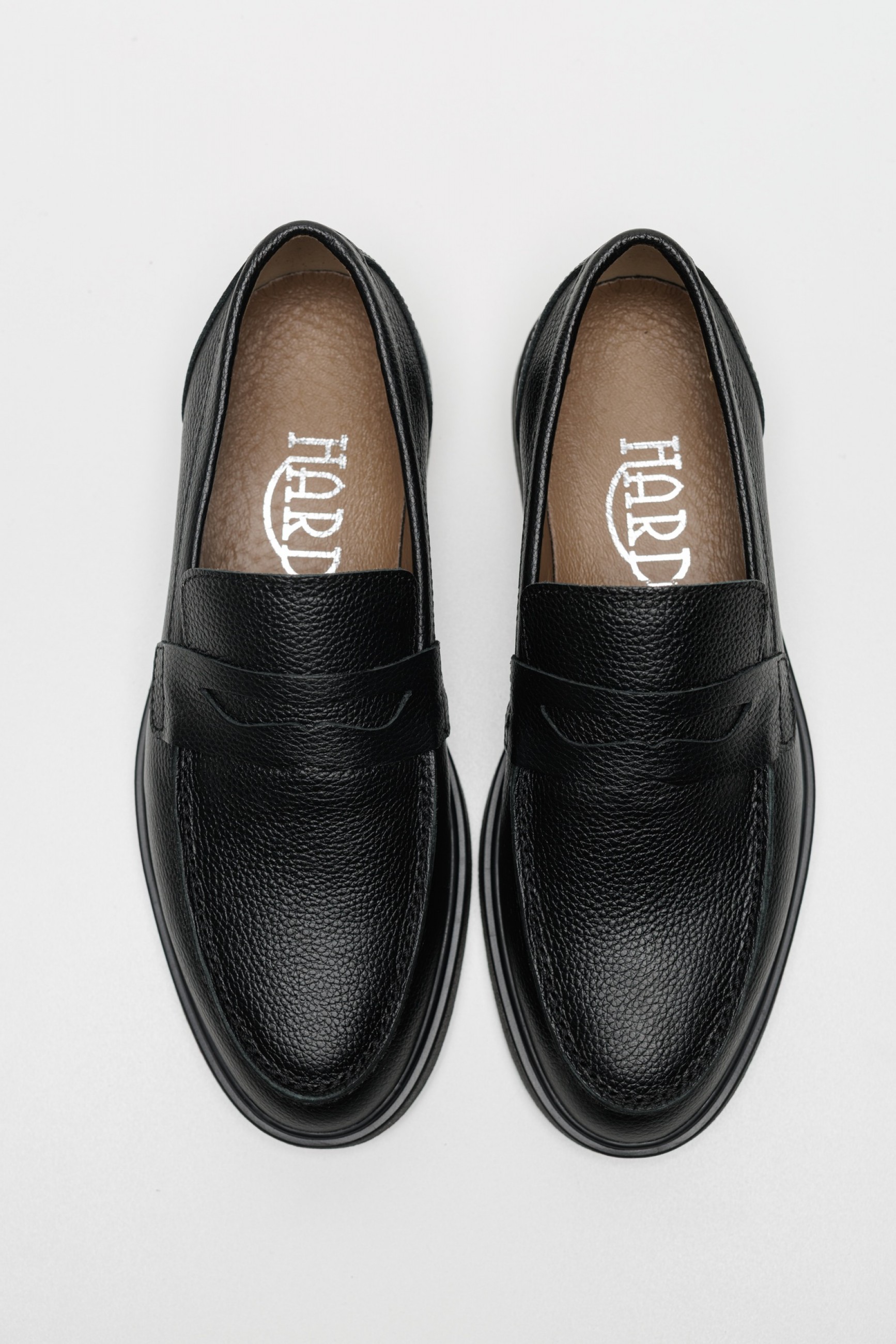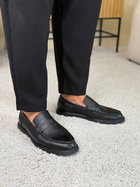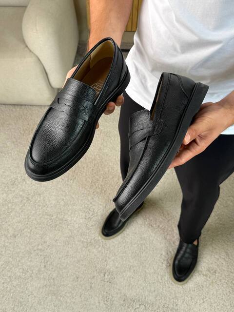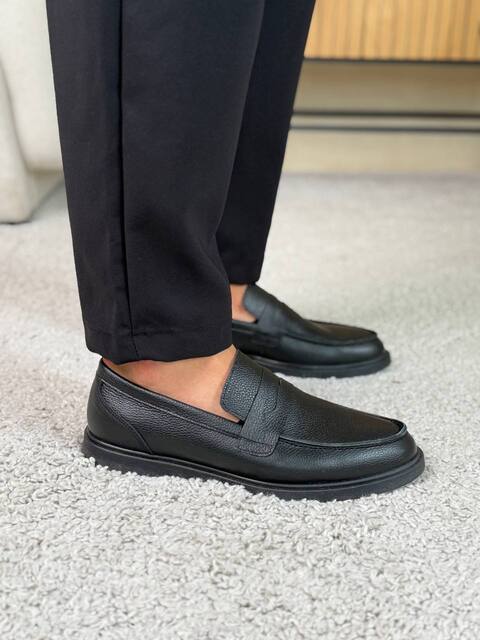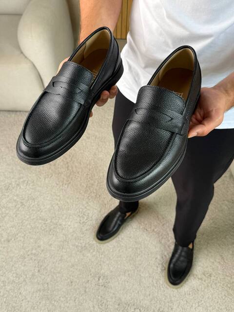 Чорні чоловічі лофери з натуральної шкіри у стилі casual-smart. Стриманий дизайн із чорною підошвою надає моделі більш сучасного та практичного вигляду. Класична форма лоферів гармонійно поєднується з джинсами, чіносами або класичними брюками, а також із сорочками, поло чи легкими светрами. М’яка натуральна шкіра та зручна поліуретанова підошва забезпечують комфорт під час щоденного носіння, роблячи цю пару вдалим вибором для роботи, міських прогулянок і ділових зустрічей у невимушеному форматі.