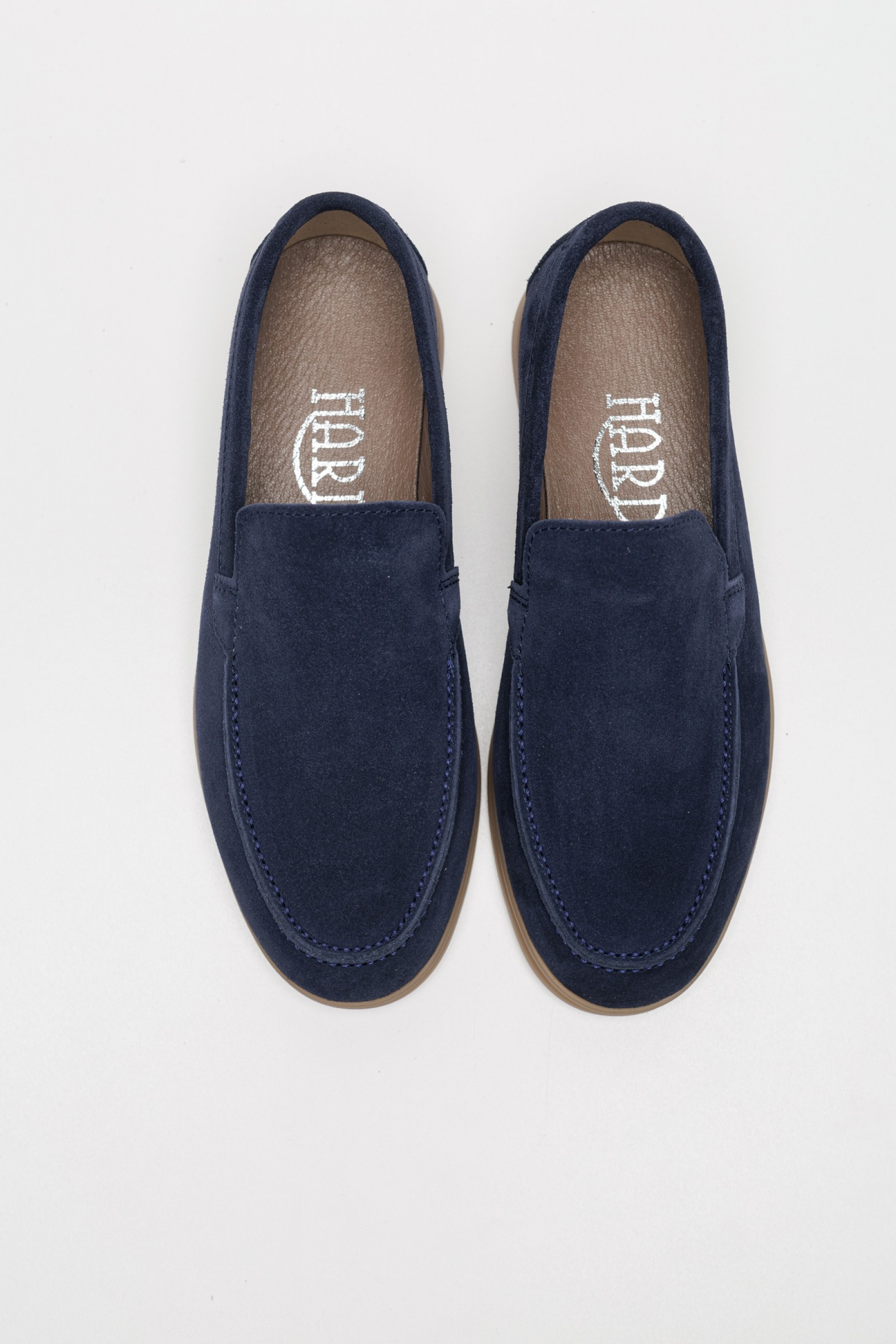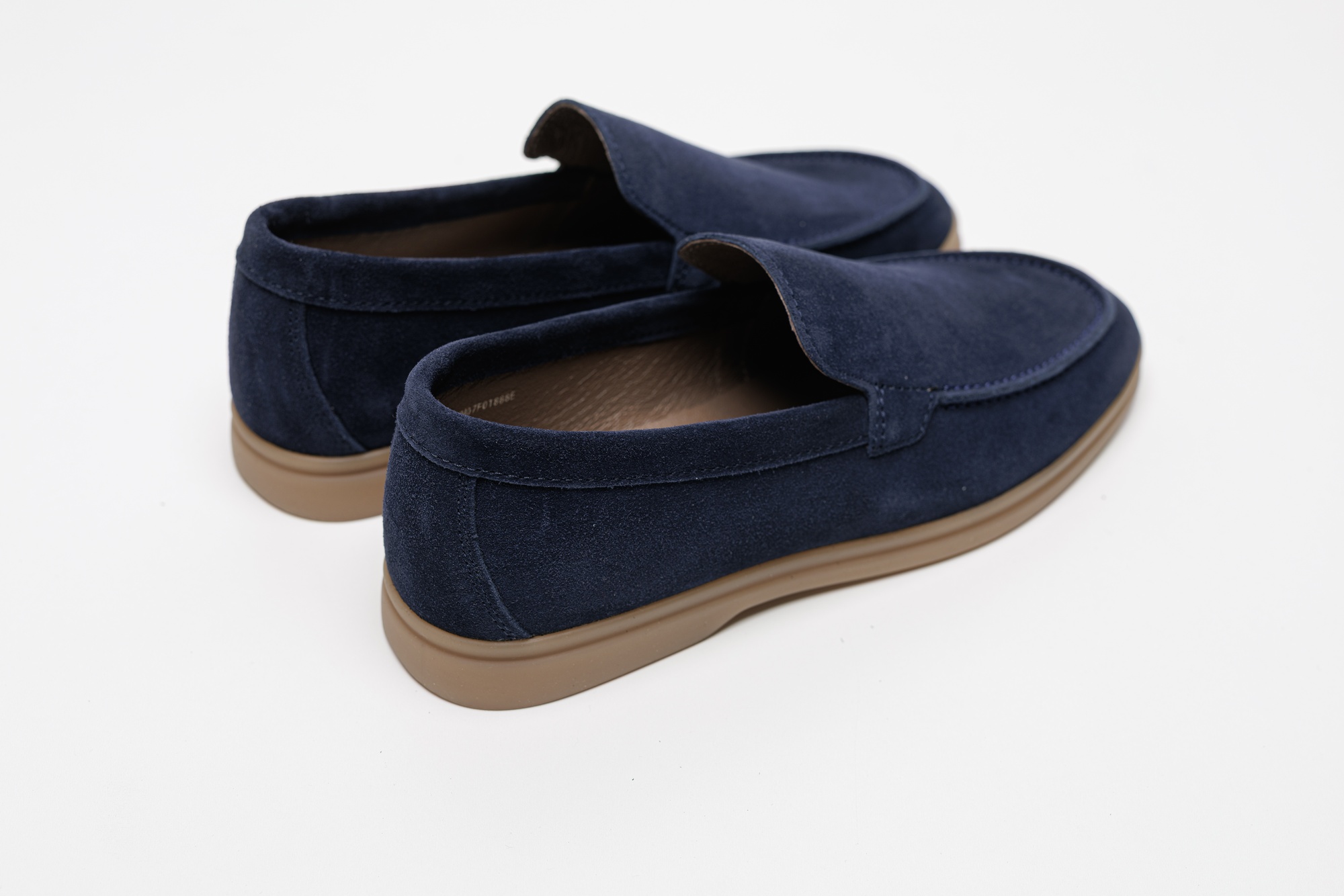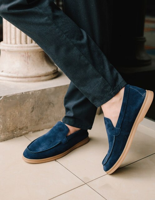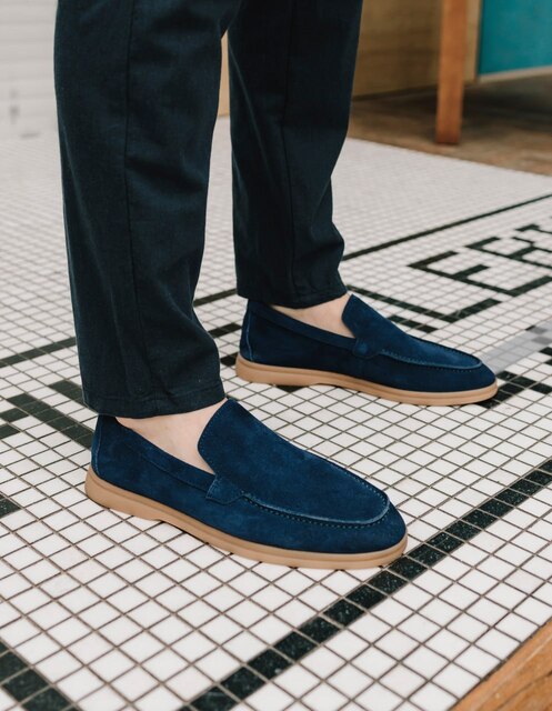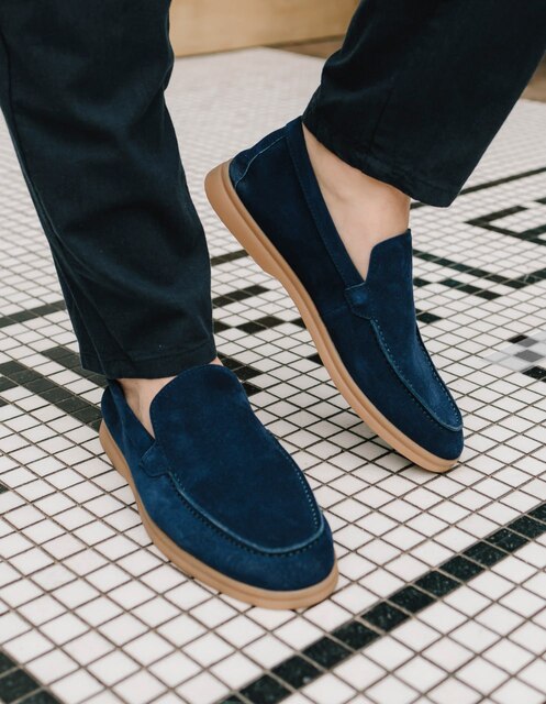 Чоловічі лофери з натуральної замші темно-синього кольору — практичний та елегантний вибір для щоденного використання. Глибокий синій відтінок виглядає стримано й водночас виразно, легко замінюючи класичні чорні або коричневі моделі в образах casual і smart-casual. Лаконічна форма з мінімалістичною прострочкою та класичною перемичкою підкреслює акуратний силует і сучасний характер взуття. Темно-синя замша гармонійно поєднується з джинсами, світлими або темними чіносами та повсякденними брюками, добре комбінується з сорочками, поло чи трикотажними верхами. Світло-коричнева поліуретанова підошва додає контрасту, забезпечує легкість, комфорт під час ходьби та стійкість до зносу. Модель підійде для офісу з демократичним дрес-кодом, міських прогулянок, зустрічей і подорожей.