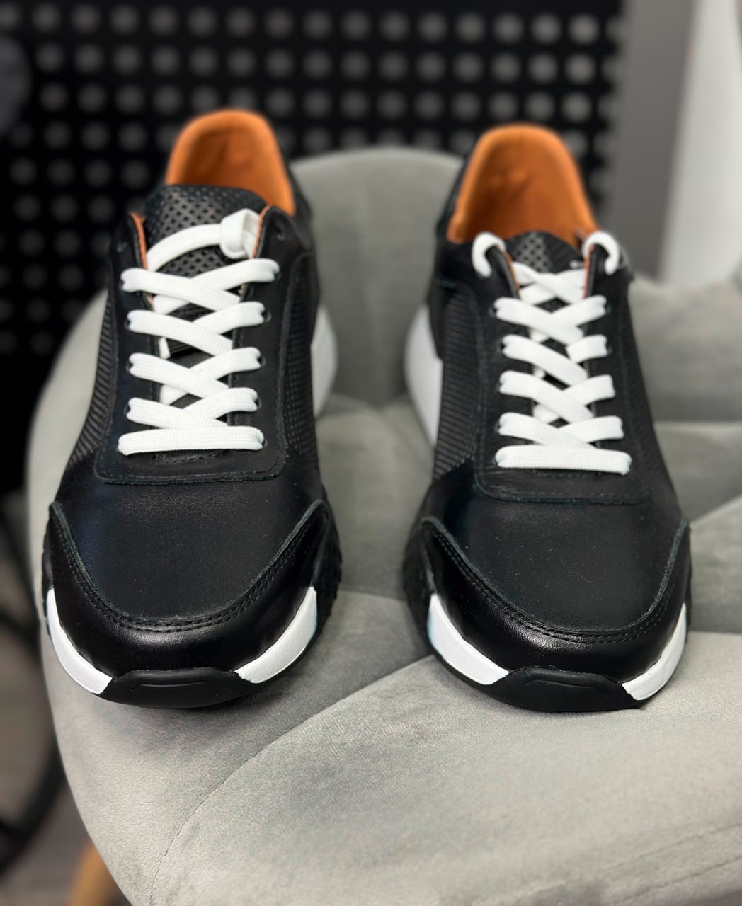 Внутрішня частина оздоблена м'якою шкірою рудого відтінку, що створює преміальний вигляд та комфортний мікроклімат для стопи протягом усього дня. Лаконічний чорний верх із білою шнурівкою робить цю модель універсальною базою: вони однаково вдало доповнюють як повсякденні джинси, так і більш стримані штани чи костюми у стилі casual. Практичний вибір для тих, хто цінує якісні натуральні матеріали та актуальний дизайн.