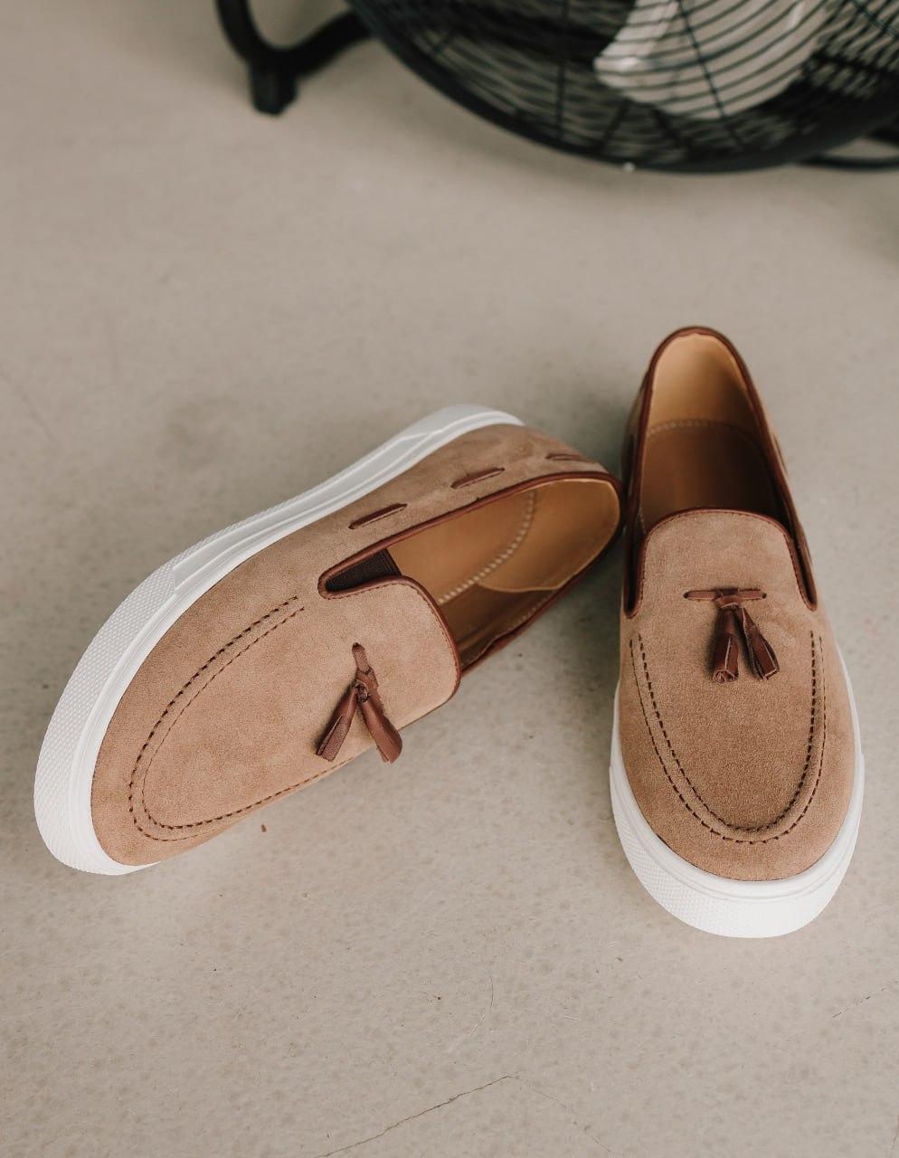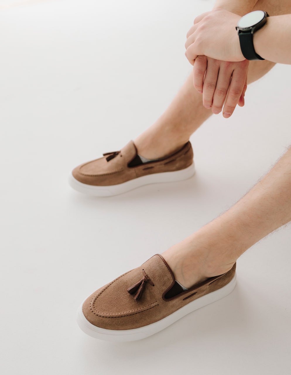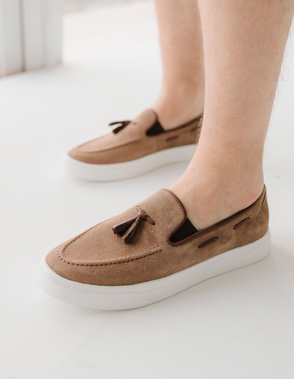 Елегантне поєднання класичного верху та спортивної підошви. Виконані з м’якої натуральної замші приємного бежевого (пісочного) відтінку. Модель доповнена стильними шкіряними пензликами та декоративною шнурівкою по боках. Ідеальний вибір для образів у стилі smart-casual.
