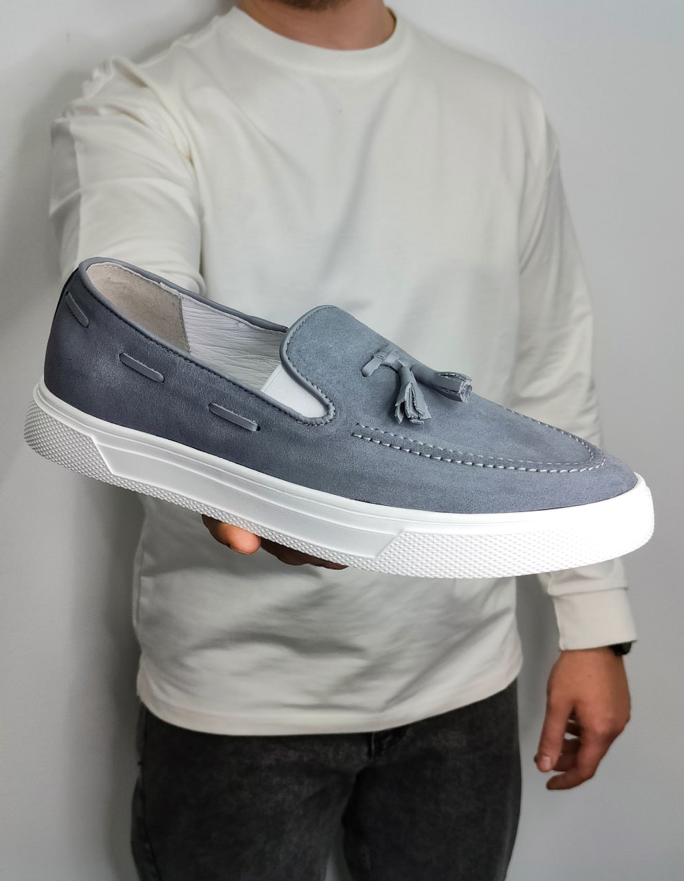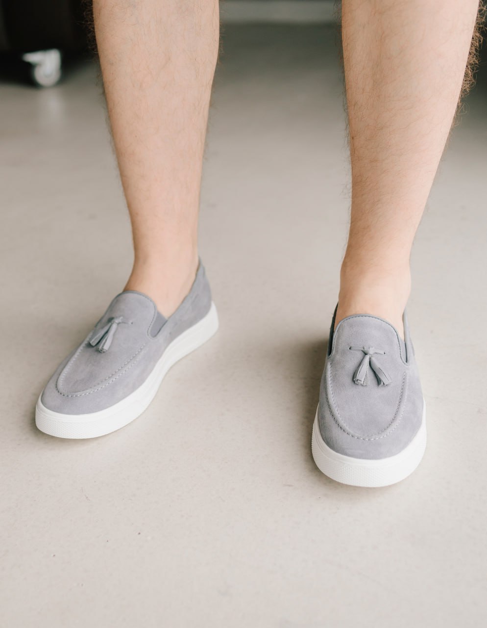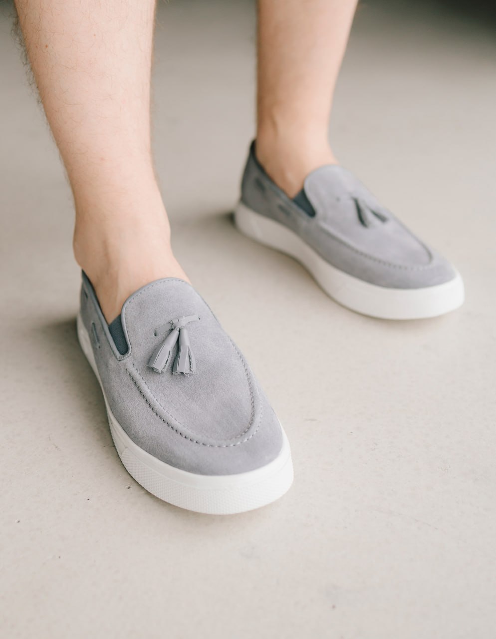 Елегантне поєднання класичного верху та спортивної підошви. Виконані з м’якої натуральної замші приємного сірого відтінку. Модель доповнена стильними шкіряними пензликами та декоративною шнурівкою по боках. Ідеальний вибір для образів у стилі smart-casual.