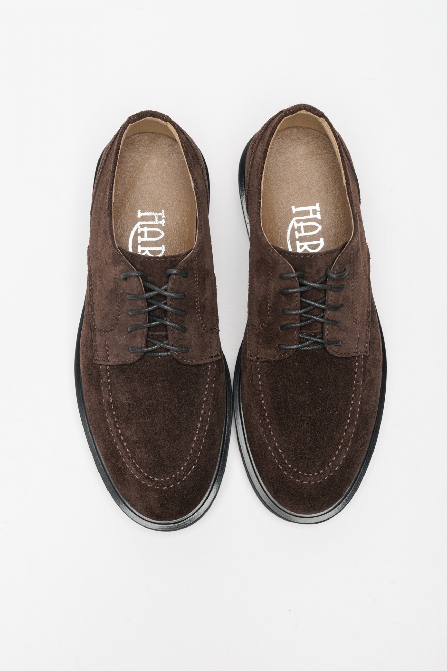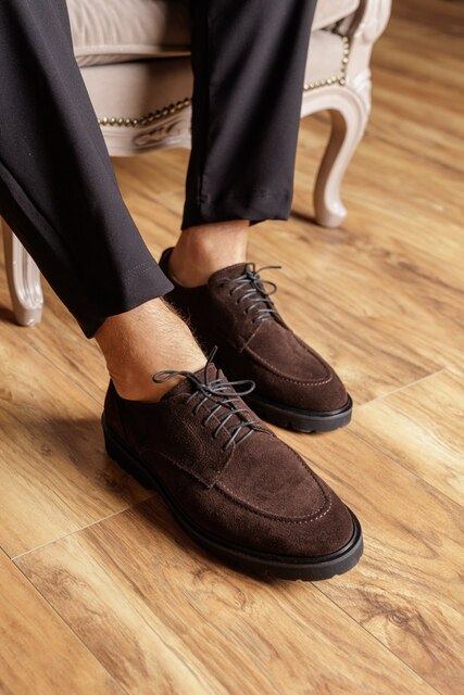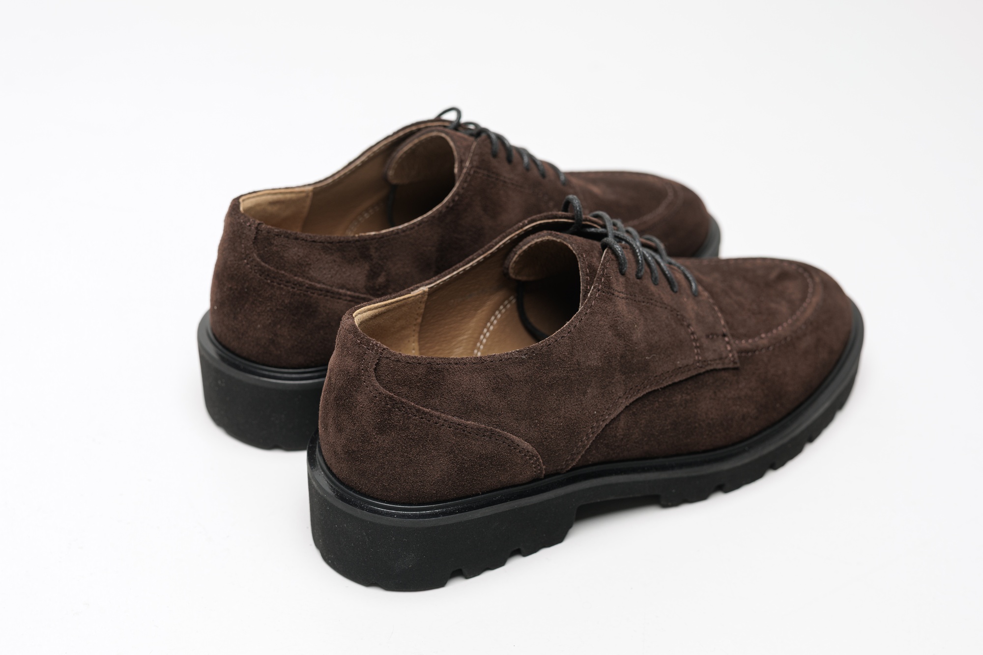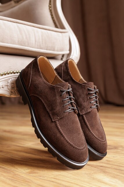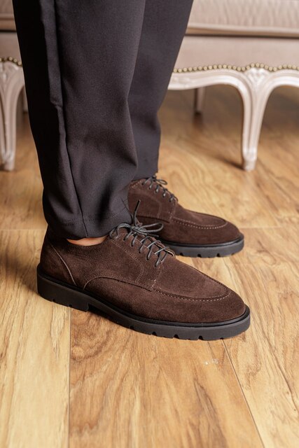 Туфлі з натуральної коричневої замші — стильна модель у сучасному виконанні, що поєднує класичний силует із практичними деталями. Лаконічний дизайн доповнений акуратною шнурівкою, яка забезпечує надійну фіксацію стопи та комфортну посадку. Верх із м’якої натуральної замші приємний на дотик і добре адаптується до форми ноги. Масивна підошва з рельєфним протектором гарантує стабільність, хороше зчеплення з поверхнею та комфорт під час ходьби. Модель органічно поєднується з класичними брюками, чіносами та smart casual-образами, підходить для міського ритму та щоденного використання.